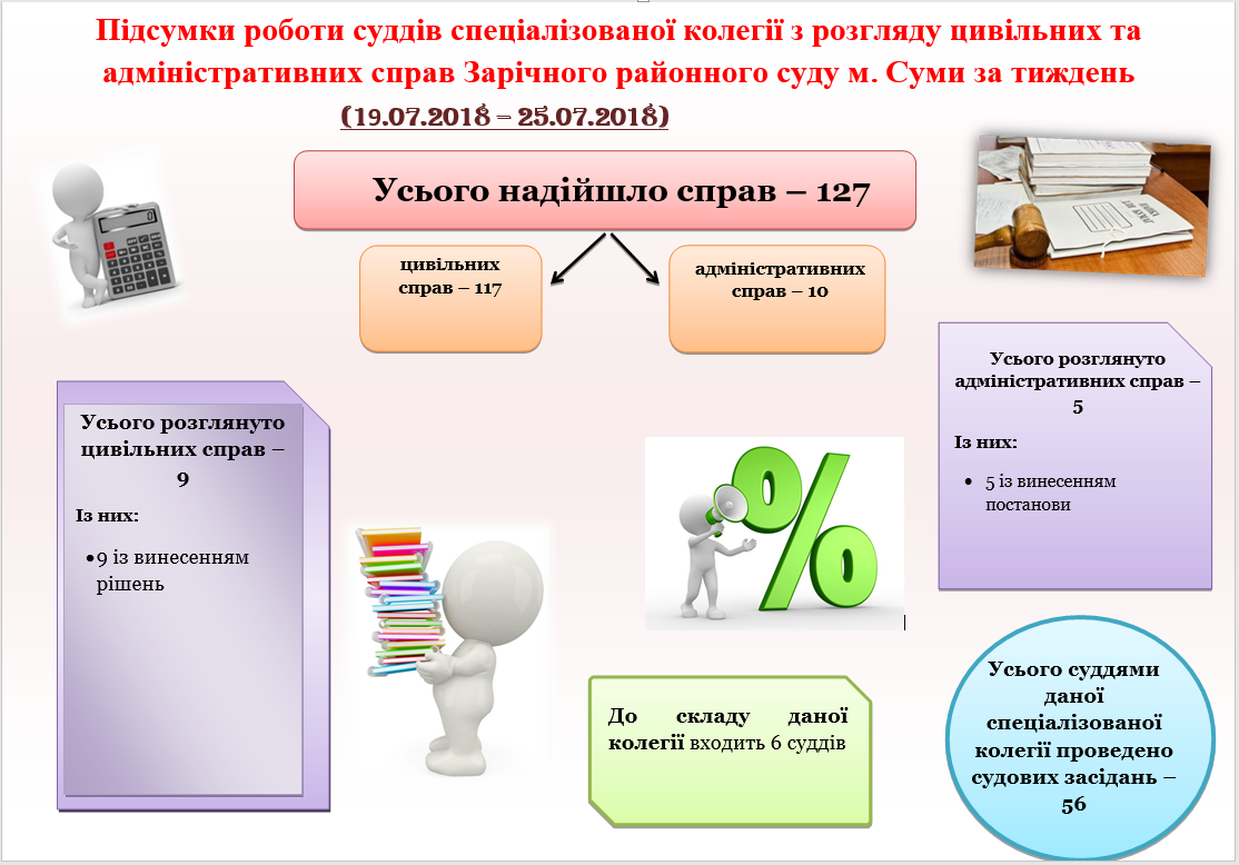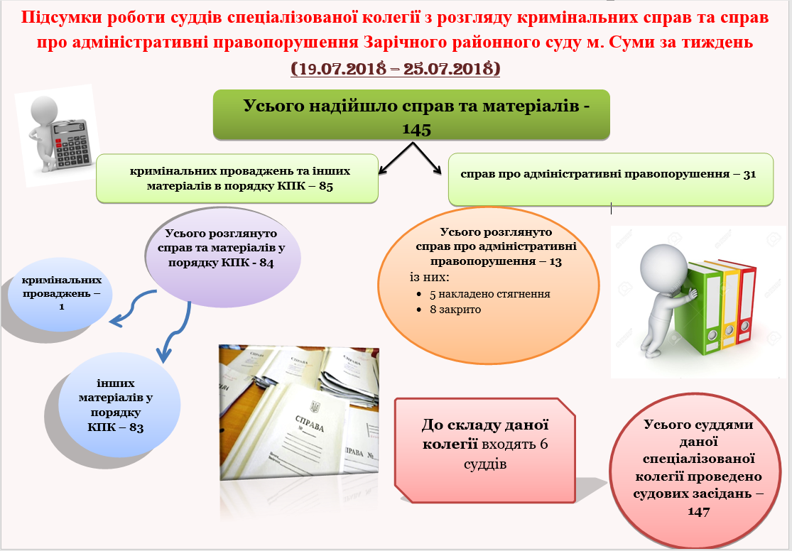 Як відзначено у офіційному повідомленні суду, інформацію щодо призначення та розгляду справ суддями спеціалізованих колегій у суді готують щотижня. Така робота проводиться з метою здійснення контролю за станом розгляду справ. Готує матеріали головний спеціаліст по роботі зі зверненнями громадян та юридичних осіб Зарічного районного суду м. Суми Юлія Попович, а узагальнені довідки обговорюють на виробничих нарадах суддів. З підсумками роботи кожної спеціалізованої колегії суддів за попередні періоди можна ознайомитися у розділі "Показники діяльності".