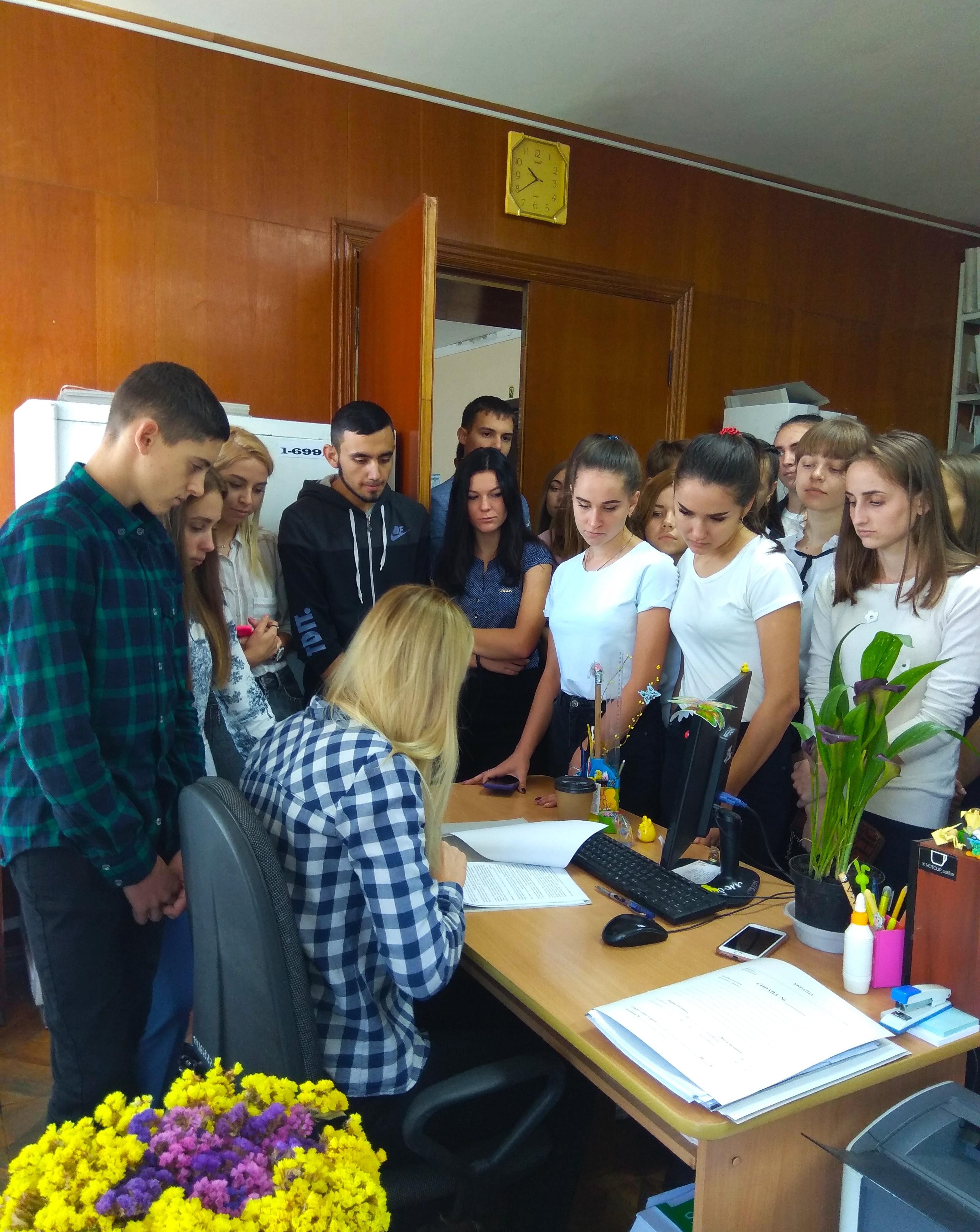 В канцелярії суду,секретар Чупінко Т. продемонструвала порядок реєстрації позовної заяви та формування протоколу автоматизованого розподілу справи, а також студенти мали змогу дізнатись про реєстрацію, рух документів, що надходять до суду та про порядок роботи з ними в програмі «Д-3».