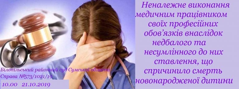 На 10:00 21 жовтня 2019 року призначено наступне судове засідання у справі стосовно К., обвинуваченої за частиною другою статті 140 Кримінального кодексу України (неналежне виконання медичним працівником своїх професійних обов’язків внаслідок недбалого та несумлінного до них ставлення, якщо воно спричинило тяжкі наслідки неповнолітньому). В судове засідання викликані свідки.