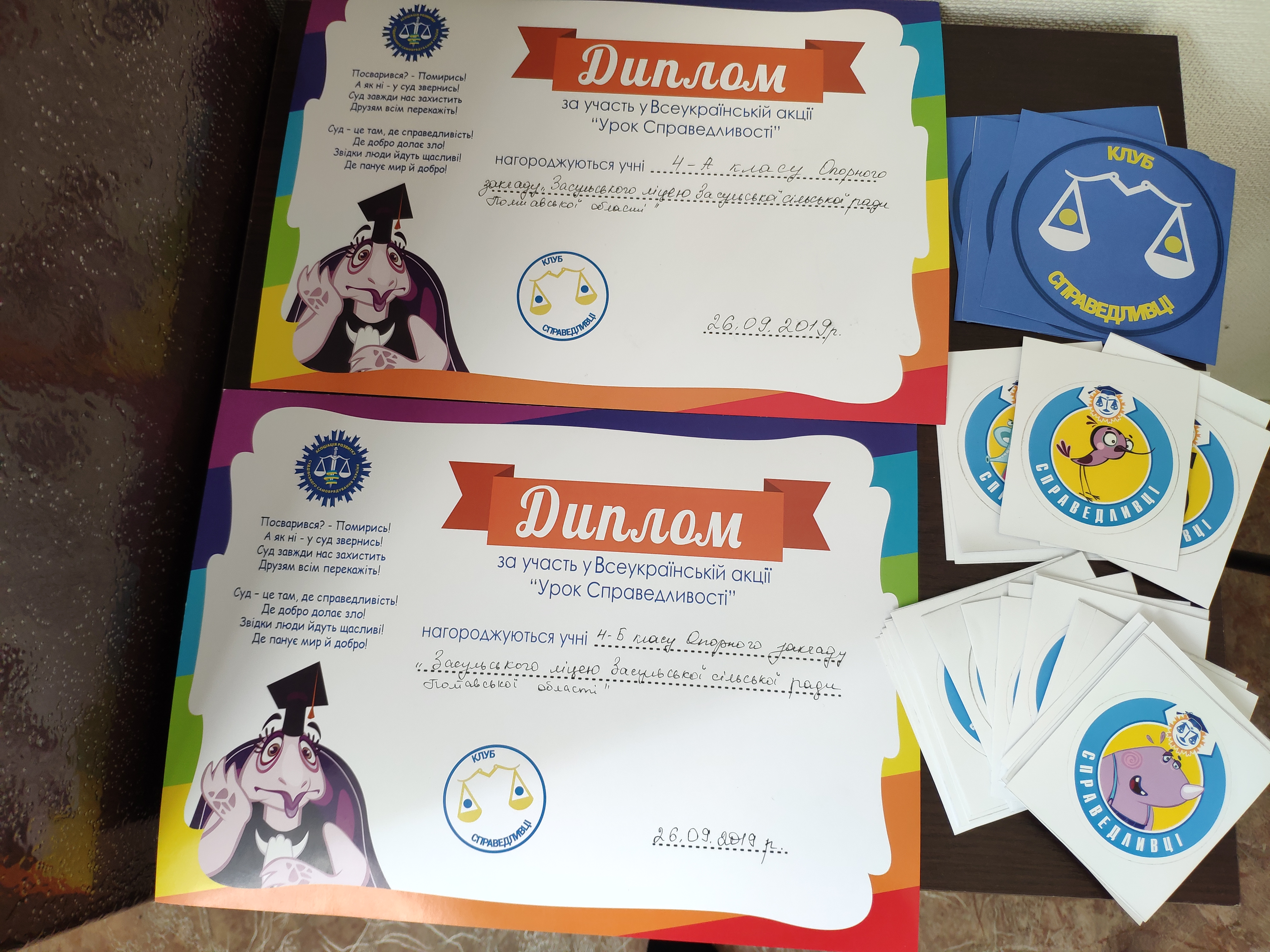 Наприкінці, голова суду Олеся Сергіївна Алтухова вручила на пам'ять про захід наліпки членів Клубу «Справедливці» кожному учаснику та дипломи для 4-А та 4-Б класів.