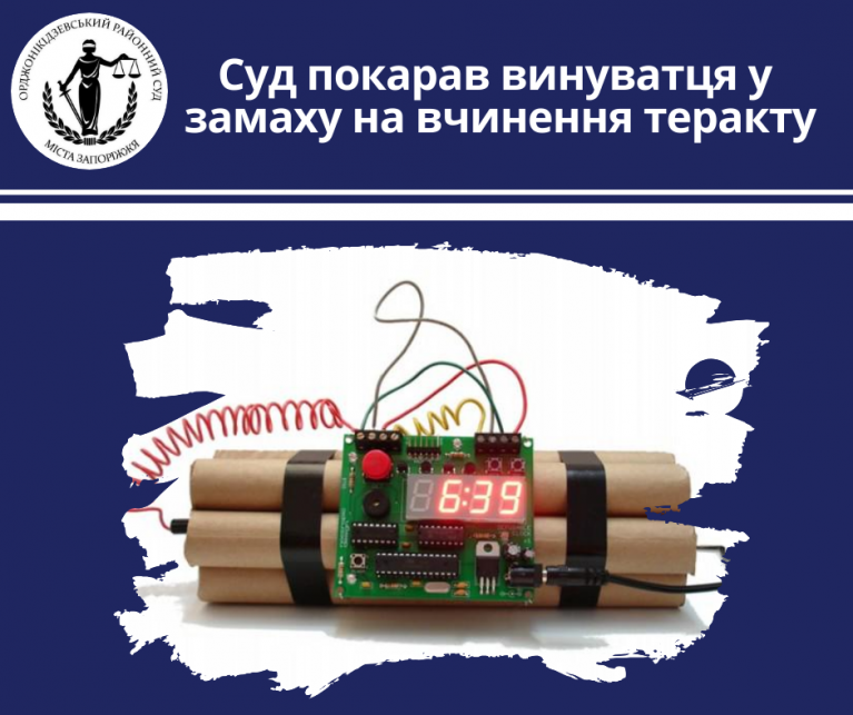 27 вересня 2019 р. Орджонікідзевський районний суд м. Запоріжжя своїм вироком затвердив угоду про визнання винуватості щодо громадянина К., обвинуваченого у вчиненні кримінальних правопорушень, передбачених частиною другою статті 15, частиною другою статті 258, частиною першою статті 263 Кримінального кодексу України («Закінчений замах на терористичний акт, тобто вчинення вибуху, який створює небезпеку заподіяння шкоди життю та здоров’ю людей, значної майнової шкоди чи настання інших тяжких наслідків, з метою порушення громадської безпеки, залякування населення, провокації воєнного конфлікту і міжнародного ускладнення, вчинене за попередньою змовою групою осіб», «Незаконне носіння, зберігання та придбання бойових припасів та вибухових речовин без передбаченого законом дозволу»).