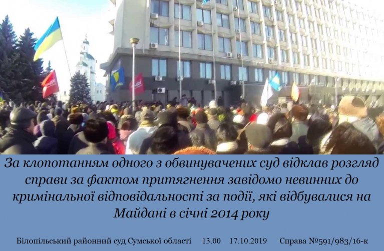 За клопотанням одного з обвинувачених на 13:00 17 жовтня 2019 року відкладено судовий розгляд кримінального провадження за обвинувальним актом по обвинуваченню колишніх прокурора прокуратури м. Сум С. і слідчої слідчого відділу Сумського МВ УМВС України в Сумській області П., обвинувачених за частиною другою статті 372 Кримінального кодексу України. В наступному судовому засіданні планується допит свідків в режимі відеоконференцзв’язку.