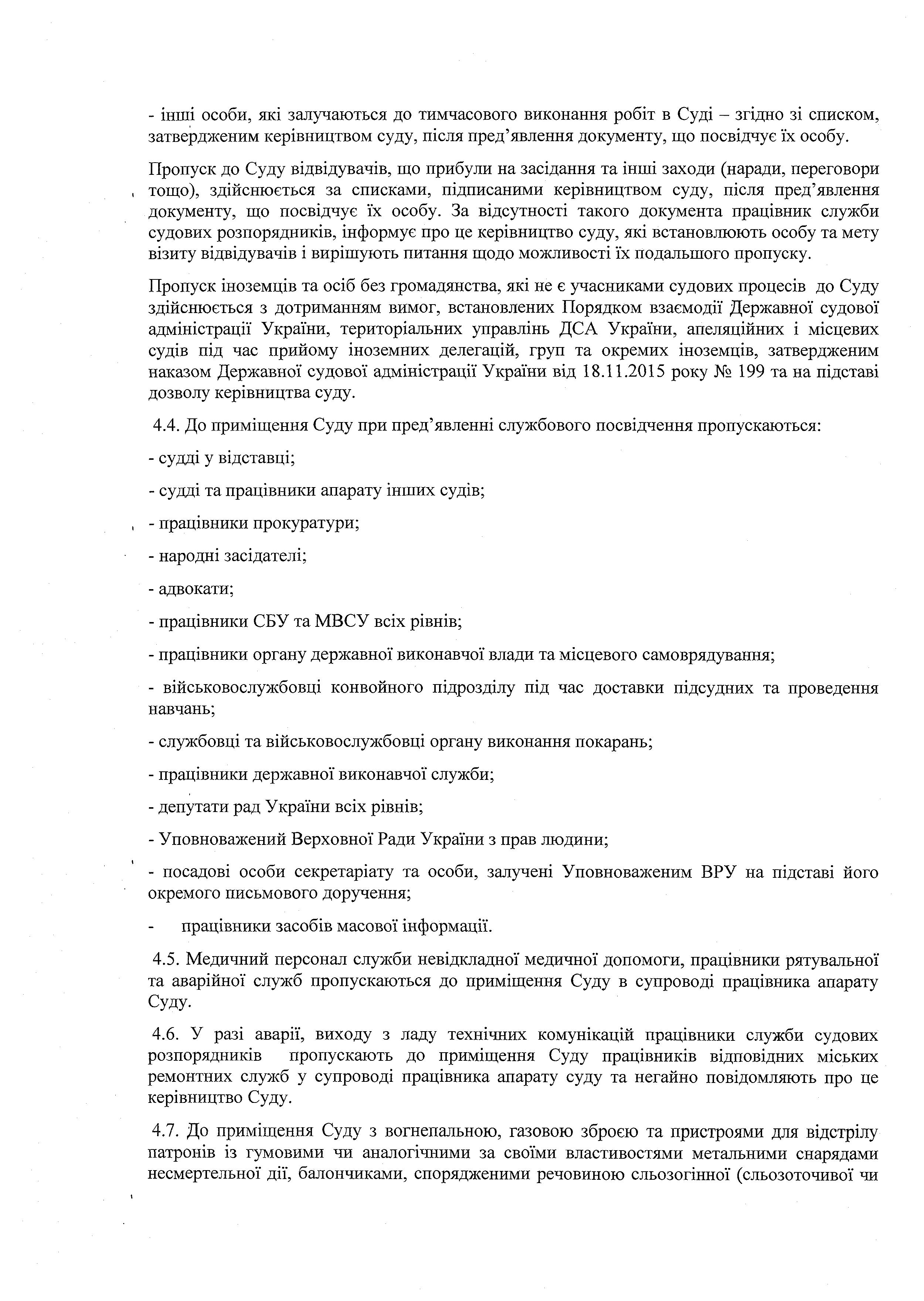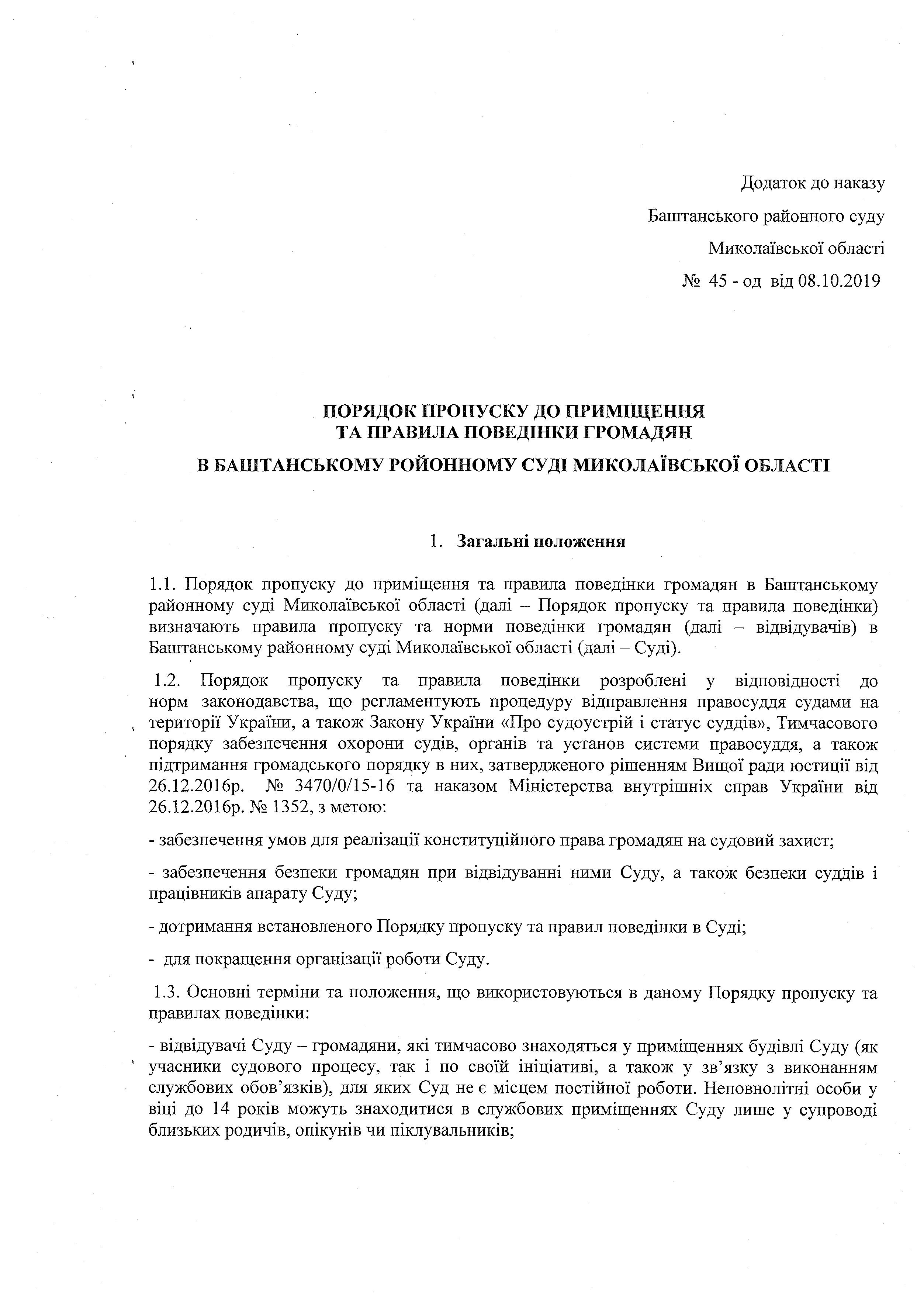 З метою забезпечення охорони та підтримання громадського порядку в приміщенні суду, 8 жовтня 2019 року наказом в.о. голови суду затверджено Порядок пропуску до приміщення та правила поведінки громадян в Баштанському районному суді Миколаївської області.