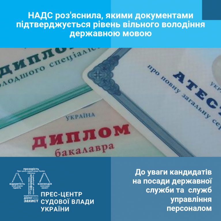 Національне агентство України з питань державної служби (далі - НАДС) надало роз'яснення, якими саме документами підтверджується рівень вільного володіння державною мовою. У своєму роз'ясненні від 11 жовтня 2019 року НАДС звертає увагу, що згідно зі статтею 25 Закону України від 10 грудня 2015 року № 889-УІІІ «Про державну службу» (далі - Закон) особа, яка бажає взяти участь у конкурсі, зокрема, мала подати до конкурсної комісії посвідчення щодо вільного володіння державною мовою.